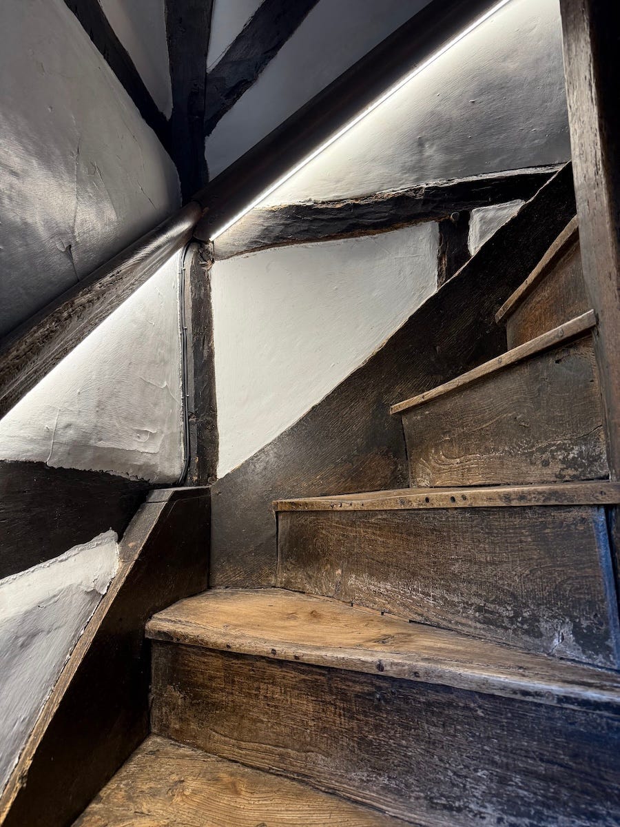 Staircase inside Anne Hathaway's Cottage (not the actress, William Shakespeare's wife!), Stratford upon Avon, Warwickshire, England.